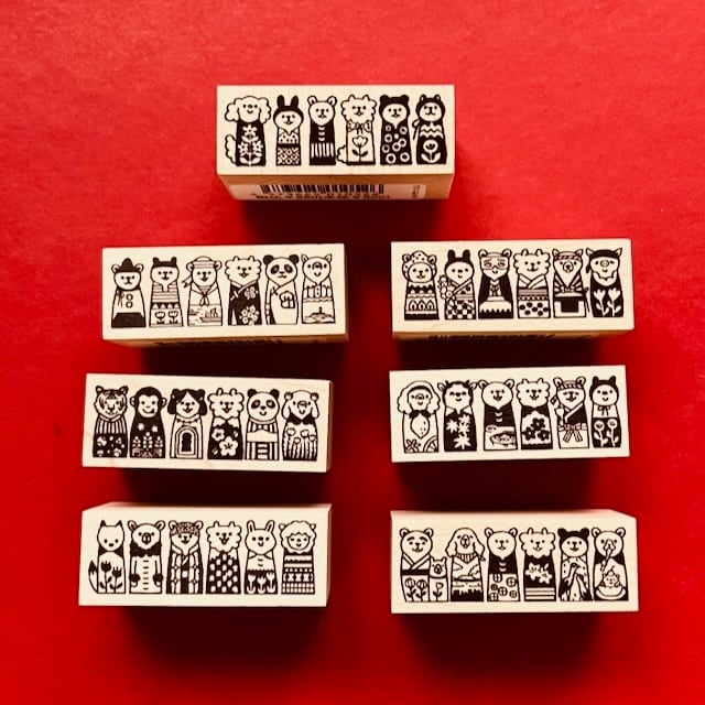 犬、うさぎ、くま、猫、くま、猫の可愛い動物のこけしが並んでいます。