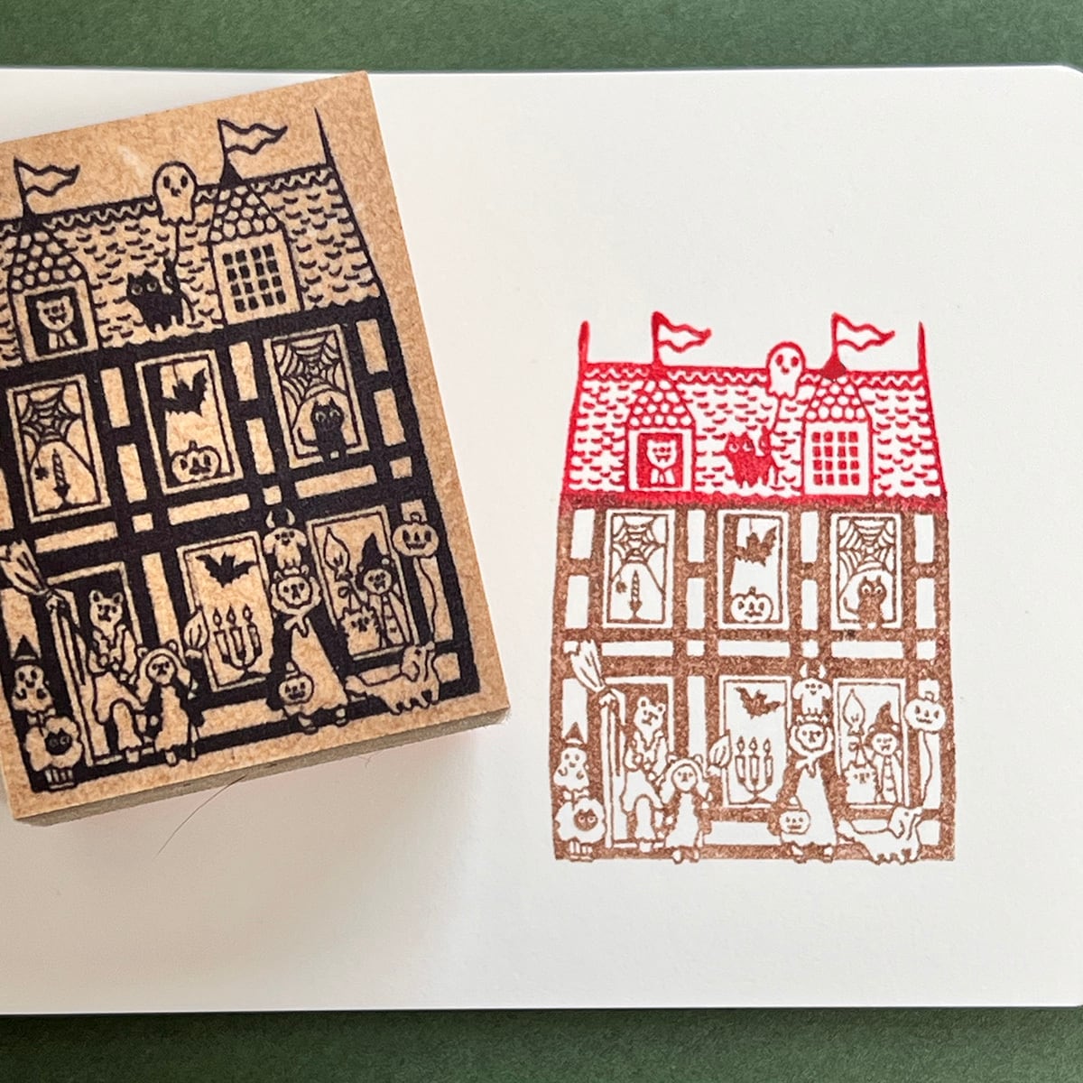 わんこがかぼちゃ風船を咥えてるのを黒猫が2階の窓から覗いてたり、ホウキを持った魔女のクマたちはお出かけかな。