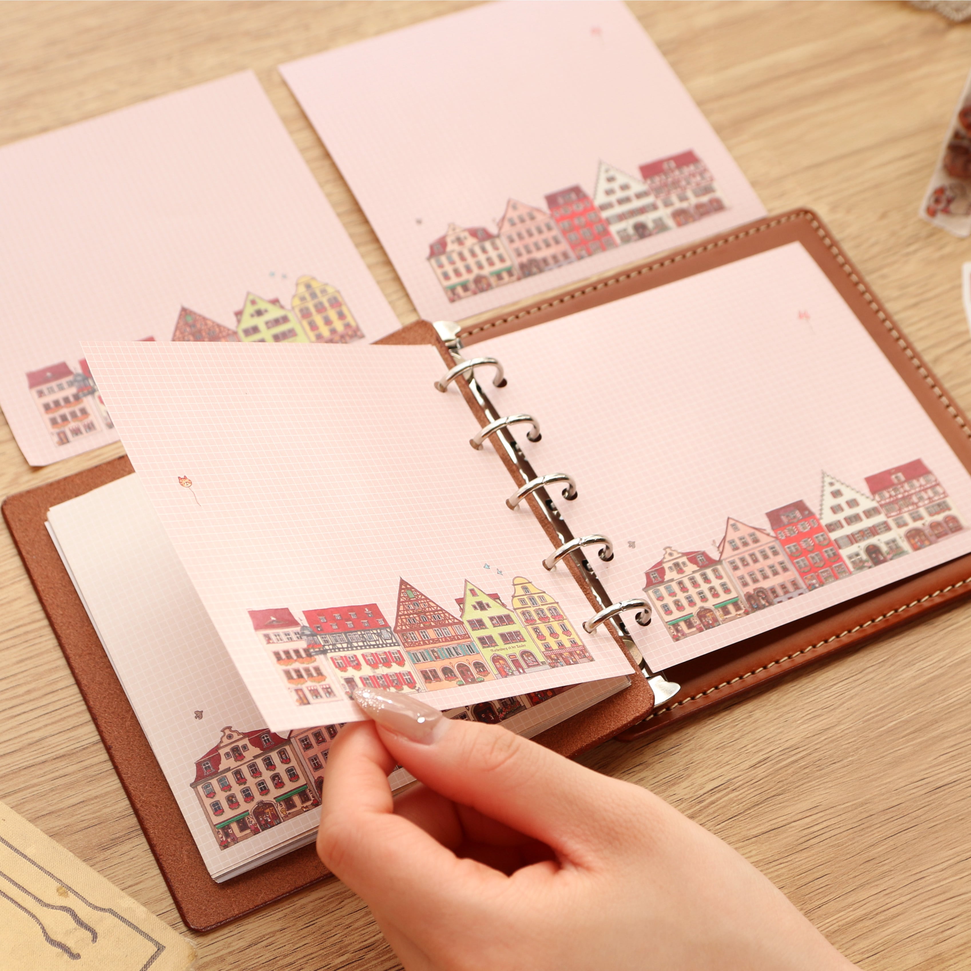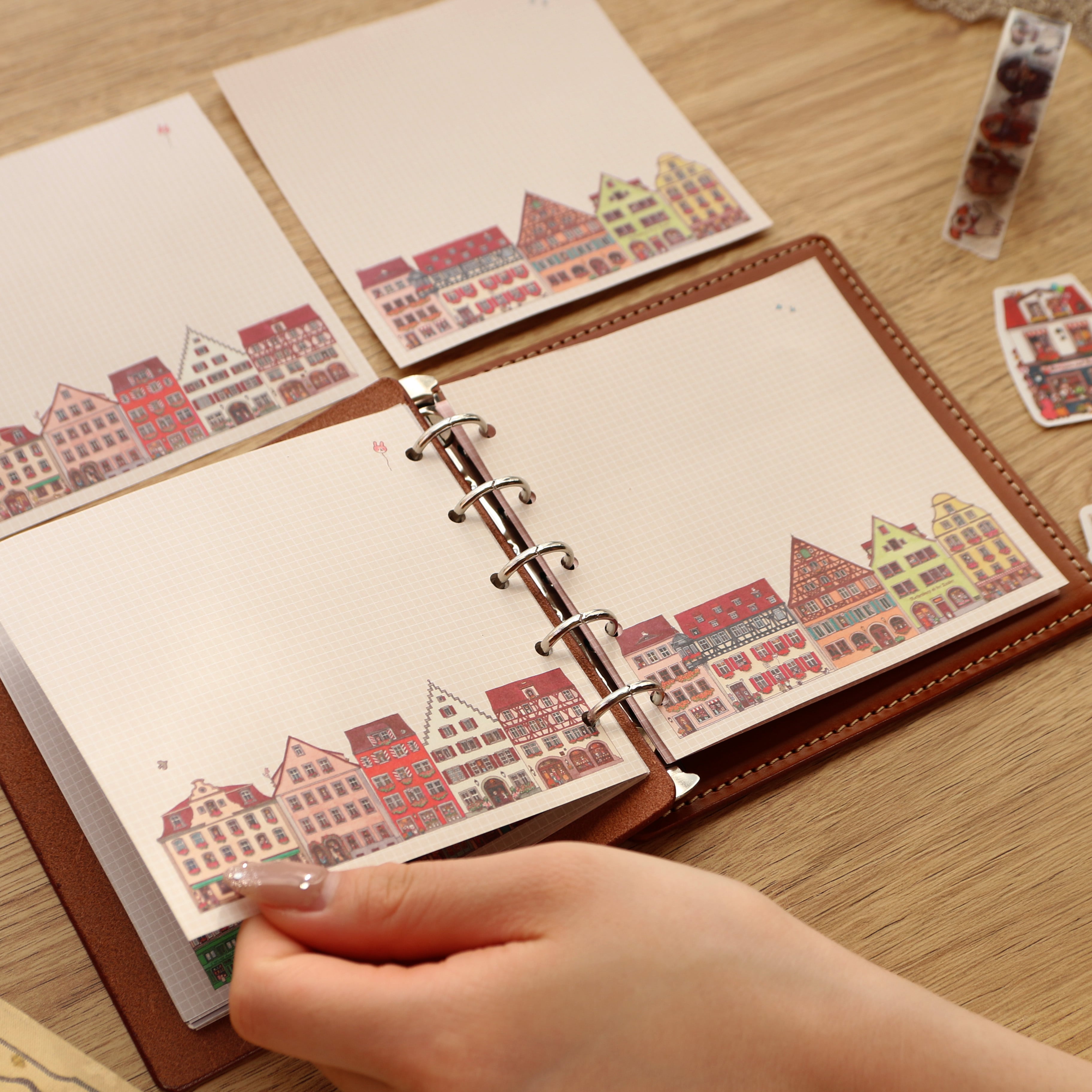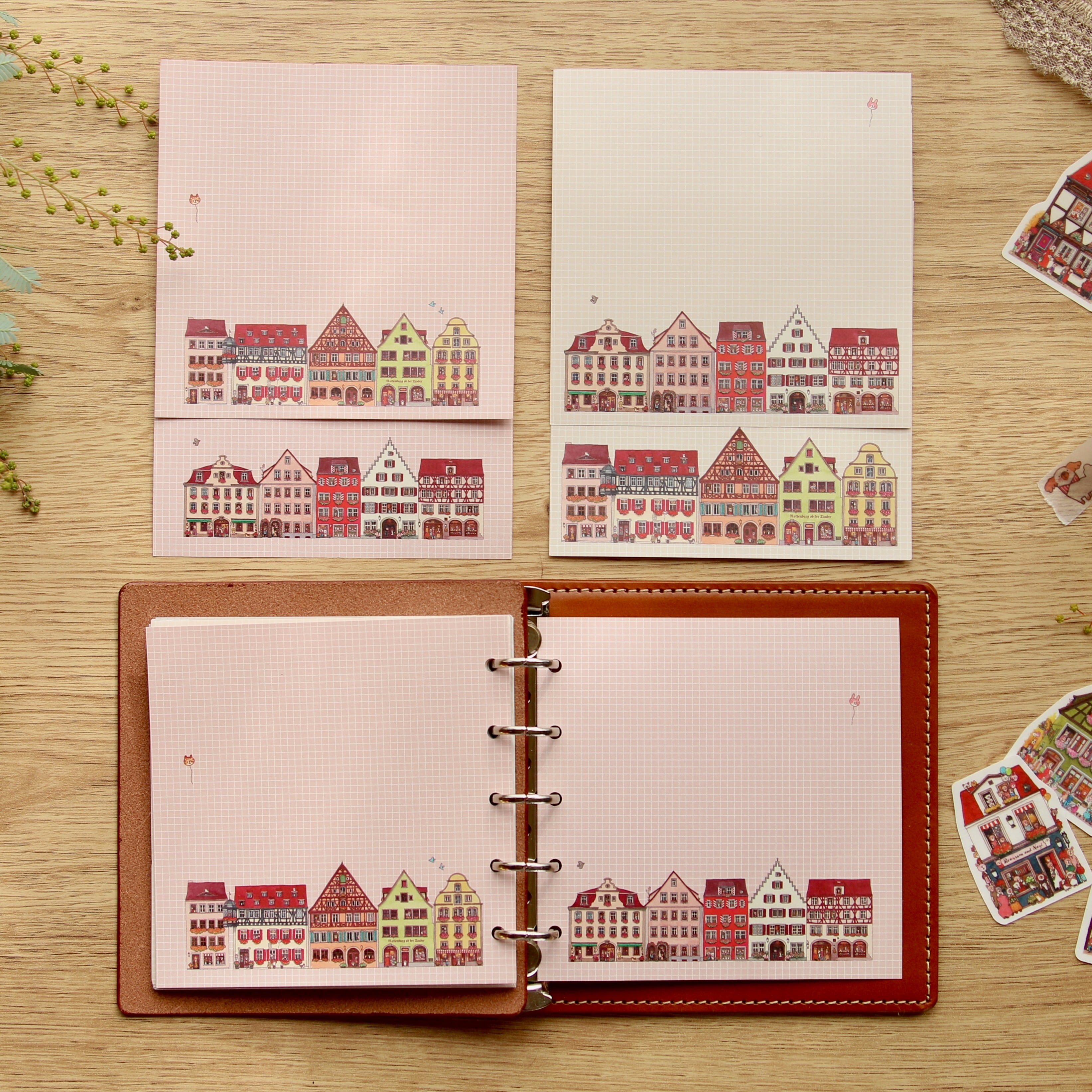 穴を開けてM5スクエアの手帳に合わせれば、色鮮やかなローテンブルクの風景を手帳に取り入れることができます。レイアウト考えて穴を開けることをお勧めします。
